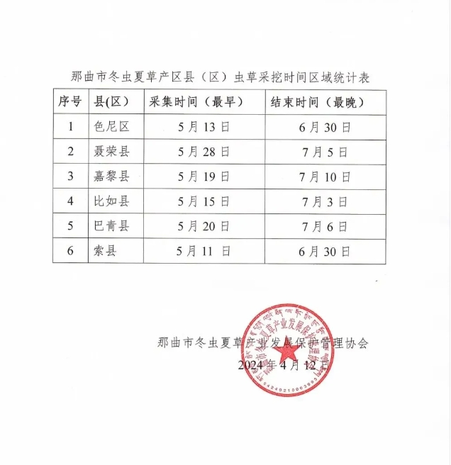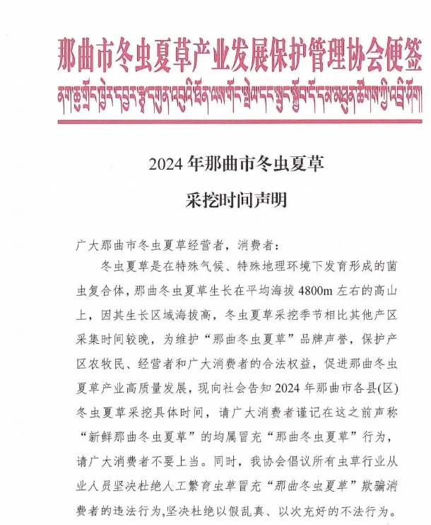 冬蟲夏草是在特殊氣候、特殊地理環(huán)境下發(fā)育形成的菌蟲復(fù)合體,那曲冬蟲夏草生長在平均海拔4800m左右的高山上,因其生長區(qū)域海拔高,冬蟲夏草采挖季節(jié)相比其他產(chǎn)區(qū)采集時(shí)間較晚,為維護(hù)“那曲冬蟲夏草”品牌聲譽(yù),保護(hù)產(chǎn)區(qū)農(nóng)牧民、經(jīng)營者和廣大消費(fèi)者的合法權(quán)益,促進(jìn)那曲冬蟲夏草產(chǎn)業(yè)高質(zhì)量發(fā)展,現(xiàn)向社會(huì)告知2024年那曲市各縣(區(qū))冬蟲夏草采挖具體時(shí)間,請(qǐng)廣大消費(fèi)者謹(jǐn)記在這之前聲稱“新鮮那曲冬蟲夏草”的均屬冒充“那曲冬蟲夏草”行為,請(qǐng)廣大消費(fèi)者不要上當(dāng)。同時(shí),我協(xié)會(huì)倡議所有蟲草行業(yè)從業(yè)人員堅(jiān)決杜絕人工繁育蟲草冒充“那曲冬蟲夏草”欺騙消費(fèi)者的違法行為,堅(jiān)決杜絕以假亂真、以次充好的不法行為。